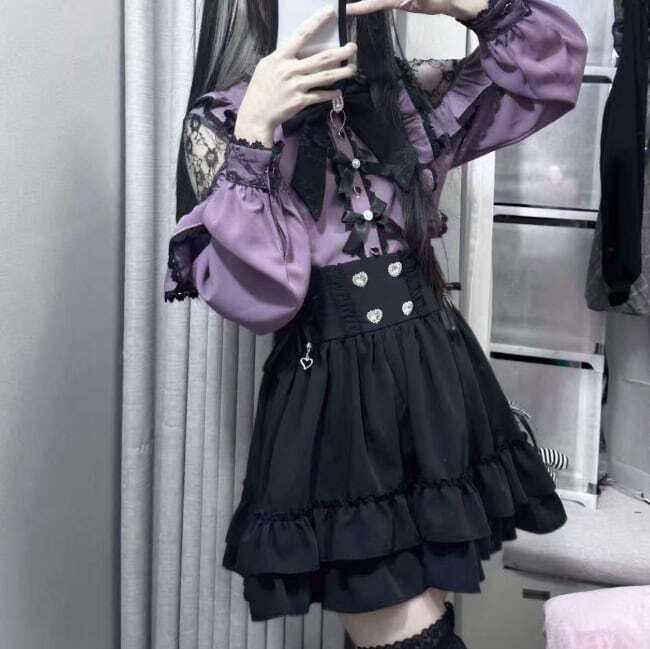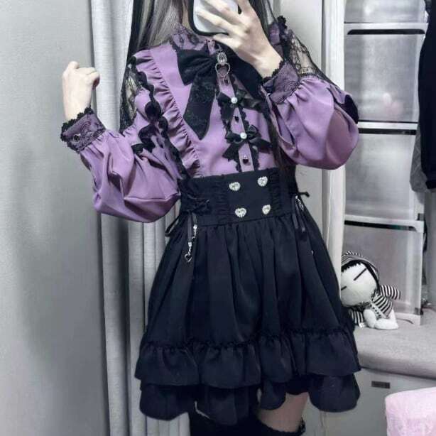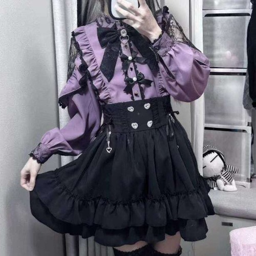ゆめかわ♡ダークレッドフリルブラウス&サスペンダースカート set69★