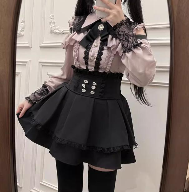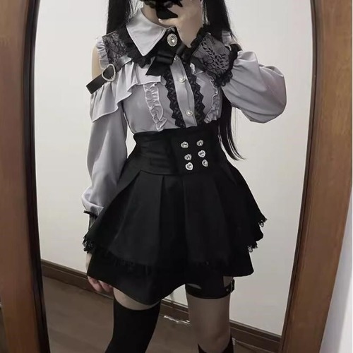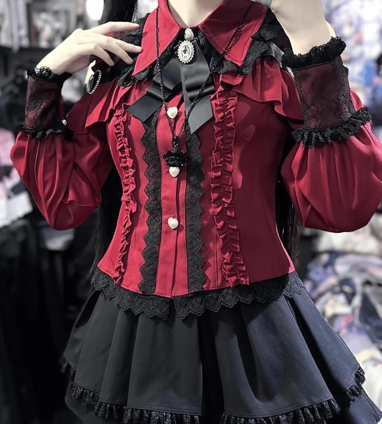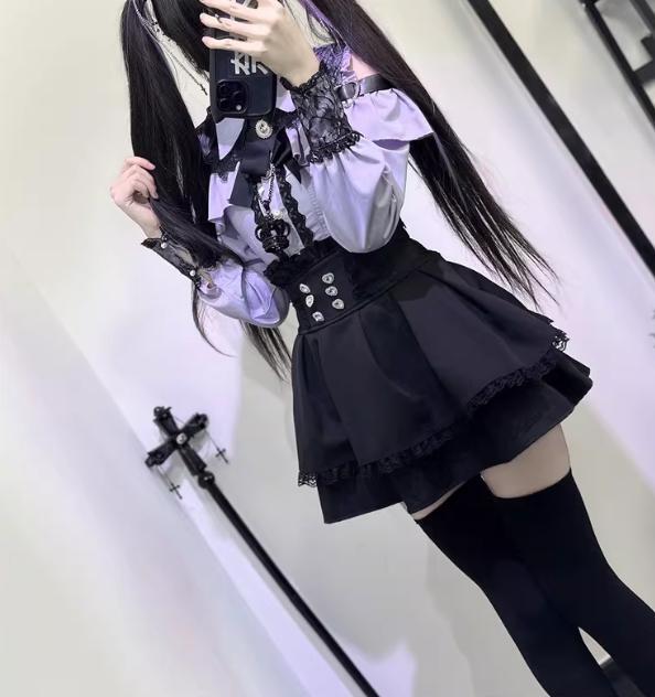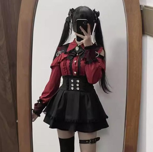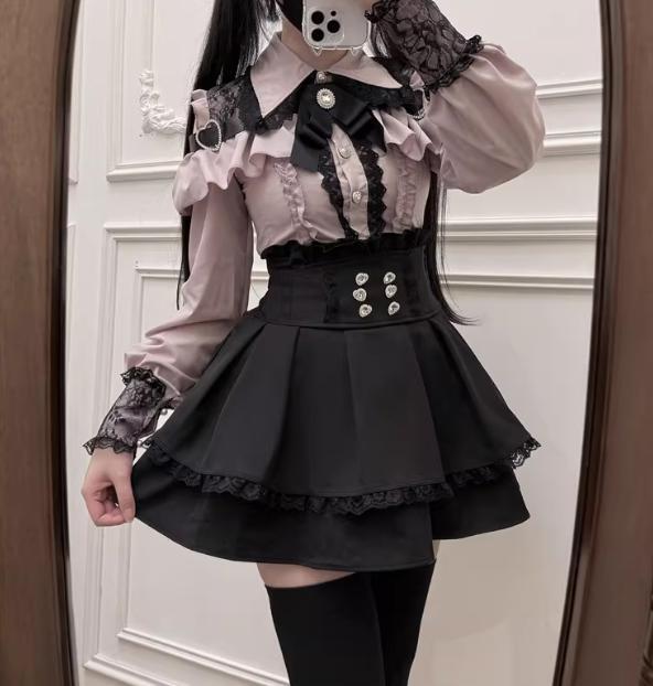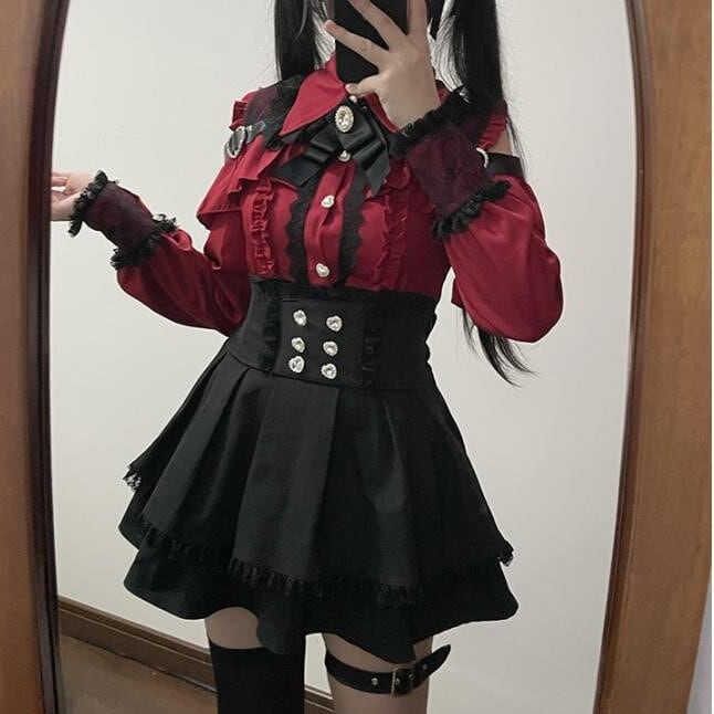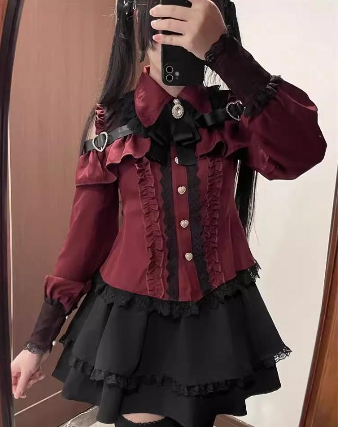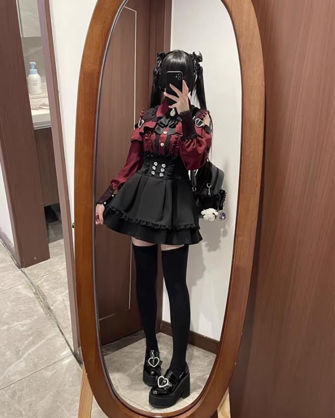 ゆめかわ♡ダークレッドフリルブラウス&サスペンダースカート set69★