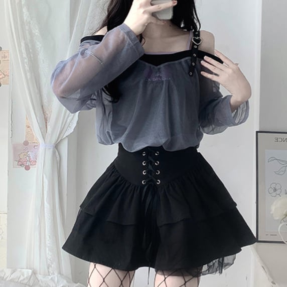 ゆめかわ♡全3カラー 選べる袖丈♪編み上げリボンブラウス tops31★